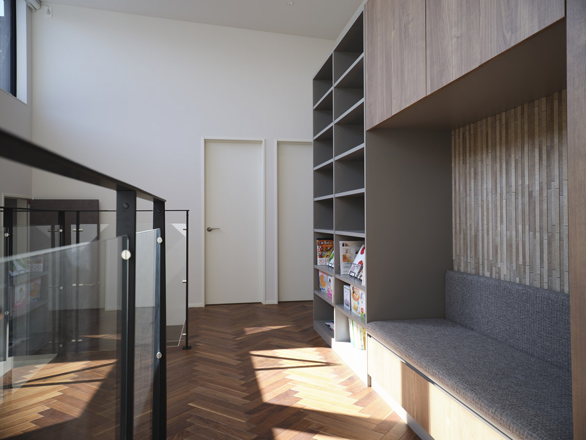 陽射しが降り注ぐホールには造作棚とベンチを設け、家族が思い思いに過ごせる心地よい空間に。隠れ家のようなヌックスペースにも注目です。