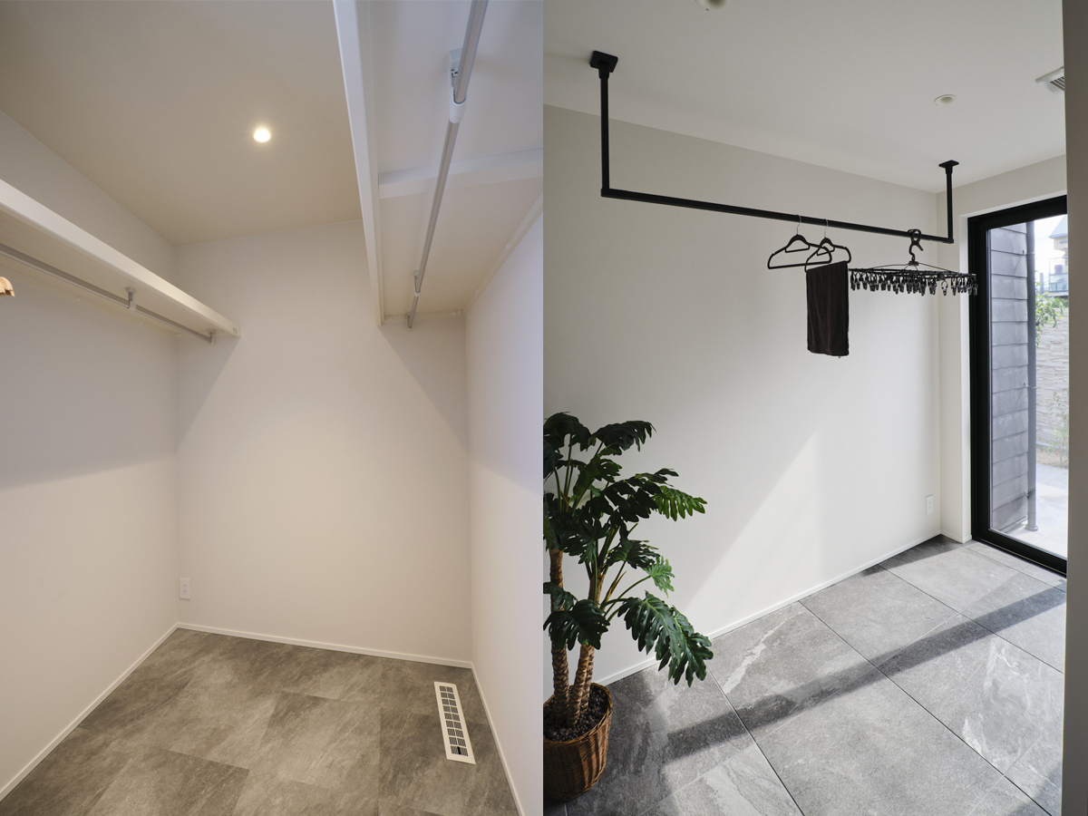 隣接したファミリークローゼットとランドリー室をはじめ、効率的な家事動線の工夫を随所に盛り込みました。ウォークインクローゼットやパントリーをはじめ、収納も充実しています。
