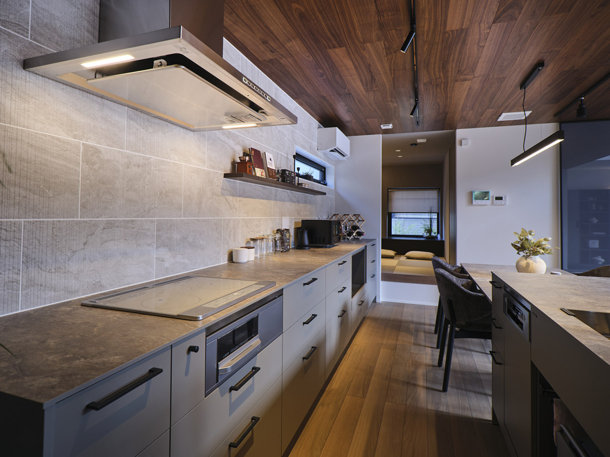 木の質感とグレーのタイルが調和したGRAFTEKT (グラフテクト)のキッチン。奥には落ち着いた雰囲気の和室があり、カフェ的な空間としても、在宅ワークやお子さまの遊び場としてもピッタリ。