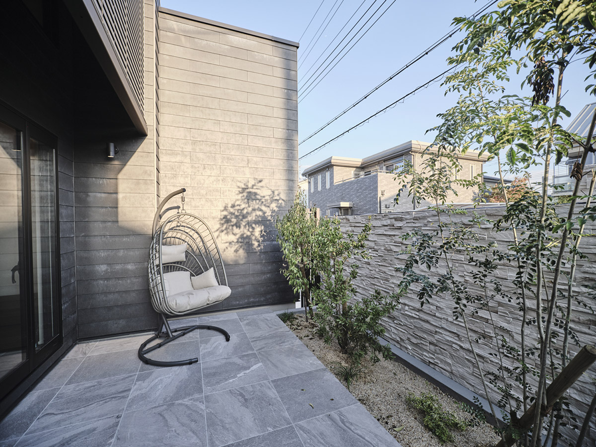 石張りの塀に、KMEWのSOLIDを全面に使用した重厚感ある外観。シャッター付きのガレージは雨天のお出かけも安心できる他、自転車やバイクのメンテナンススペースとしても。