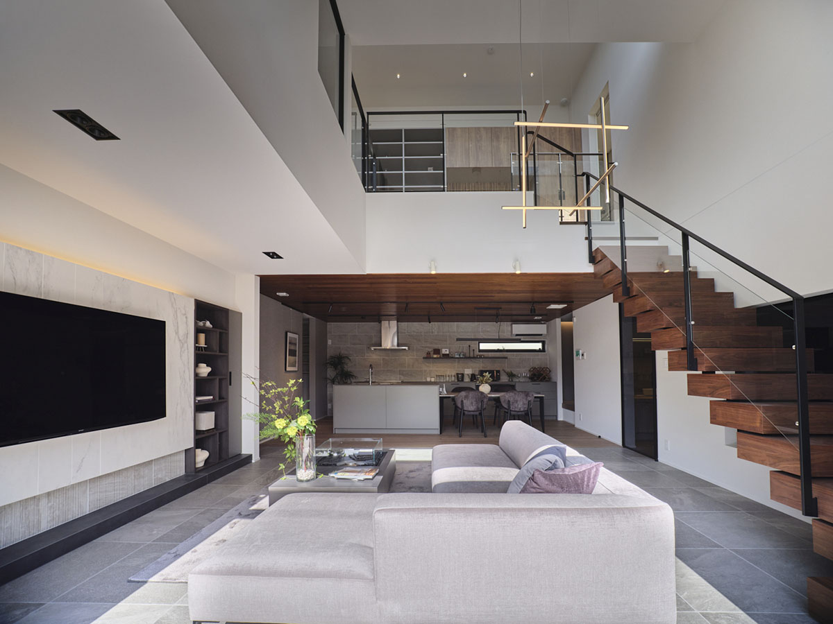 SE構法105を採用することで耐震性を確保しながら、柱や壁を在来工法よりもずっと減らして大開口・大空間を実現しました。大理石調のアクセントウォールとスケルトン階段が、光と風が通り抜ける大開口とあわさり、洗練された空間に。