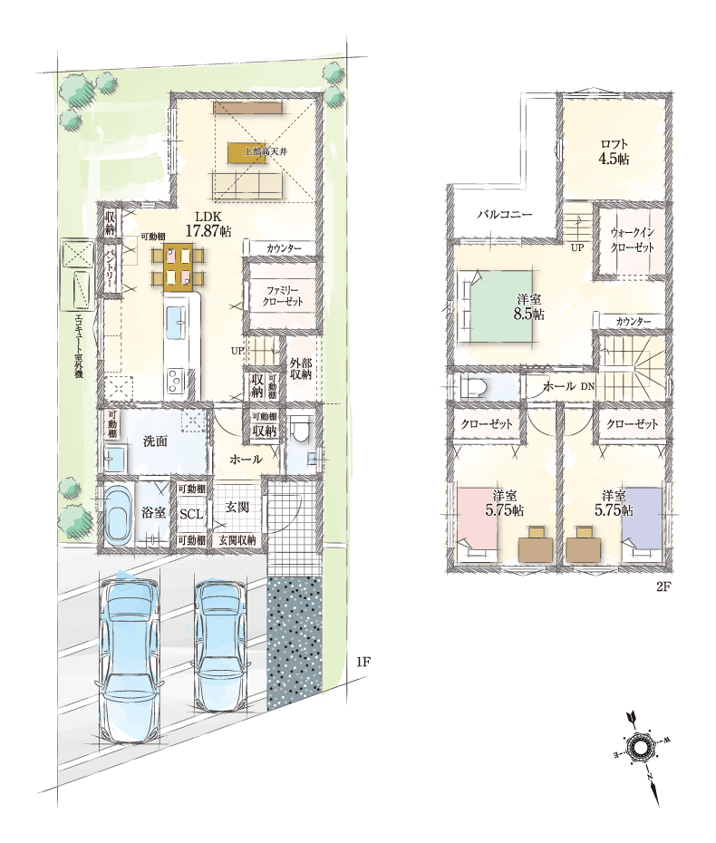 落ち着いた色合いのツートンカラーの外観が、街並みにやさしく馴染む一邸。深い軒の玄関は、自然と家族を迎え入れる 安心のスペースに。ほどよいシンプルさだからこそ、長く住むほど愛着が増すデザインです。