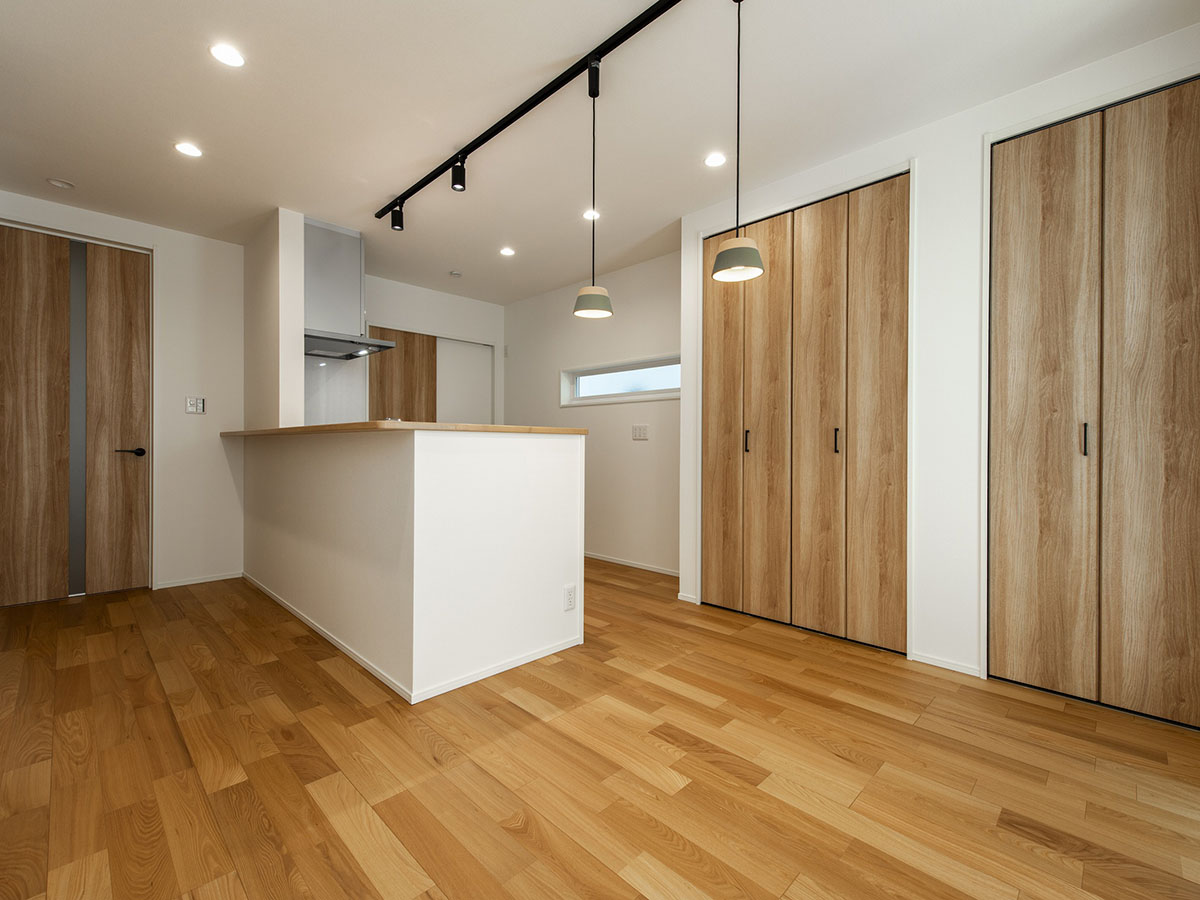 リビングサイドにはお子様のスタディコーナーやパソコン作業などに便利なカウンターを設けました。リビングの高天井は板目調のクロスをあしらい、シーリングファンを備えています。