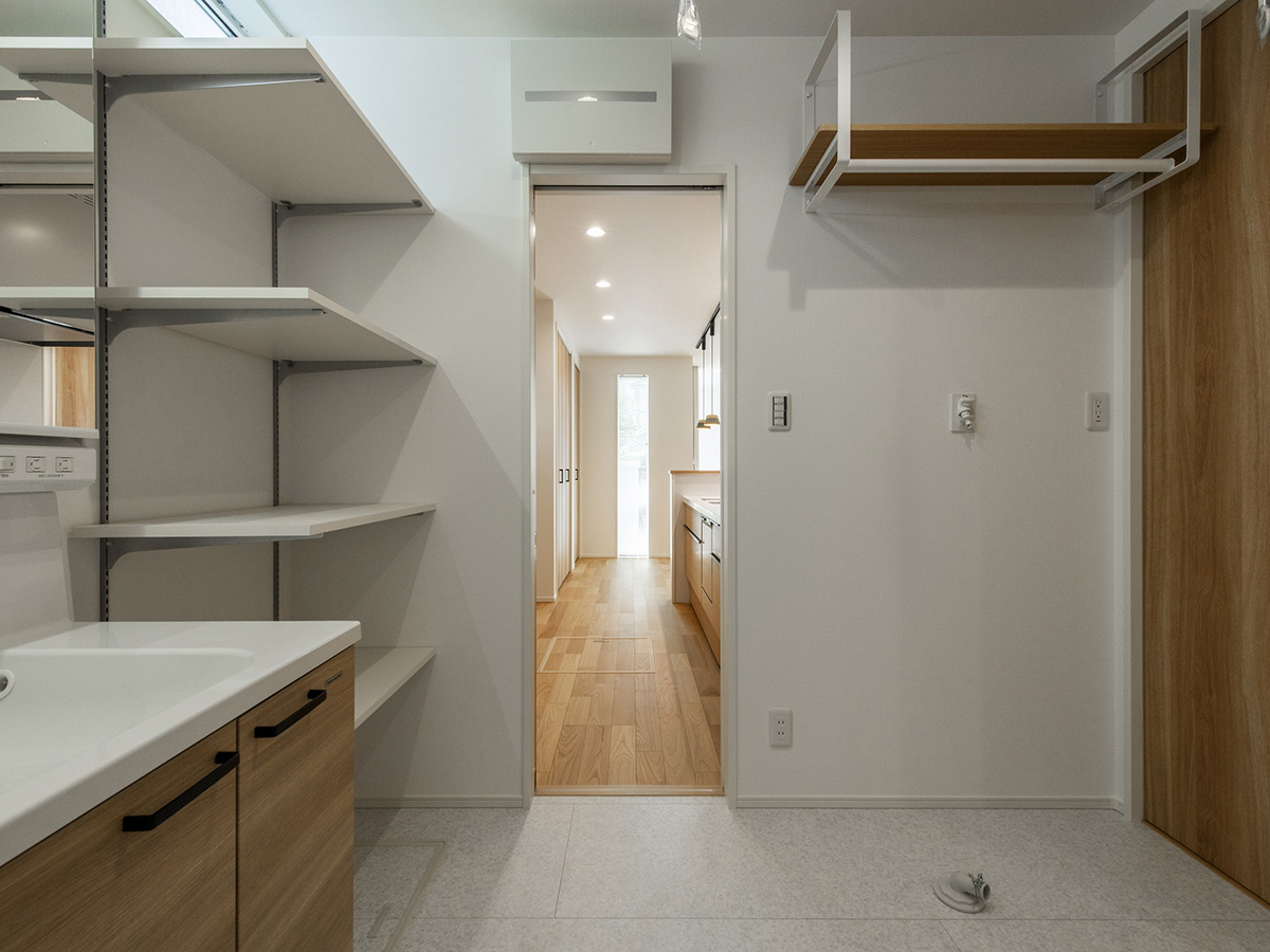 可動棚や物干し設備のある洗面室はランドリー兼用。洗面へは玄関ホールとキッチンからの2Wayアクセスで、キッチン↔︎洗面↔︎玄関ホールとタイパの良い生活動線を実現しました。