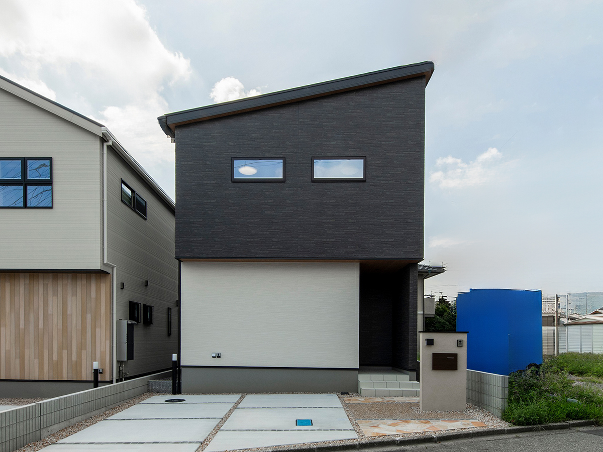 落ち着いた色合いのツートンカラーの外観が、街並みにやさしく馴染む一邸。深い軒の玄関は、自然と家族を迎え入れる 安心のスペースに。ほどよいシンプルさだからこそ、長く住むほど愛着が増すデザインです。